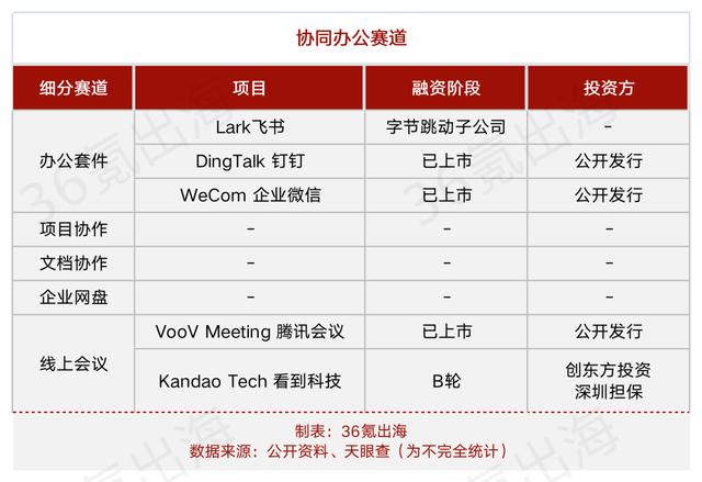 中国出海的协同办公软件基本背靠大厂,产品功能与国内版本无太大区别,包括即时消息、音视频会议、日历、协作文档、云盘、工作台等。